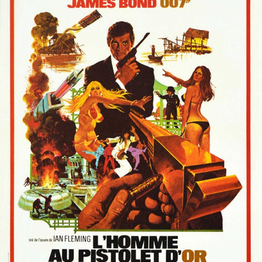 Original vintage cinema poster for the French release of the James Bond movie The Man with the Golden Gun - L'Homme au Pistolet d'Or - starring Roger Moore as James Bond agent 007, Christopher Lee and Britt Ekland and directed by Guy Hamilton with the title song performed by Lulu and composed by John Barry. Great artwork depicting Roger Moore as James Bond holding a gun surrounded by images of film scenes, including women in bikinis, martial arts fighters, an explosion in a futuristic building and scenes along a river in an Asian village with a golden gun pointing at James bond in the foreground, being loaded with a bullet engraved with the number 007 on it. Artwork by the American artist Robert E McGinnis. Very good condition, folds, minor bumps on edges.