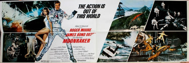 Original vintage cinema poster for the 007 James Bond movie, Moonraker, starring Roger Moore, Lois Chiles (Holly Goodhead), Michael Lonsdale (Hugo Drax) and Richard Kiel (Jaws). Great image of Roger Moore as 007 and Lois Chiles with the tagline "The action is out of this world" and movie stills featuring fighting scenes and scenes in outer space. Horizontal. Large. Good condition, folds, minor loss on folds.
