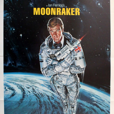 Original vintage cinema poster for the 007 James Bond movie, Moonraker, starring Roger Moore, Lois Chiles (Holly Goodhead), Michael Lonsdale (Hugo Drax) and Richard Kiel (Jaws). Great image of Roger Moore as 007 blasting into space. Artwork by Dan Goozee (b 1943). International teaser sheet. Good condition, folds.