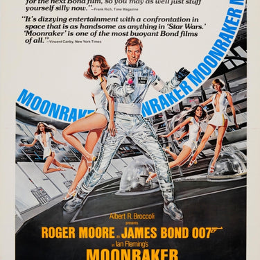 Original vintage cinema poster for the 007 James Bond movie, Moonraker, starring Roger Moore, Lois Chiles (Holly Goodhead), Michael Lonsdale (Hugo Drax) and Richard Kiel (Jaws), directed by Lewis Gilbert. Great image showing Roger Moore as James Bond wearing a space suit and standing in a spaceship, holding a gun in front of him with a Bond Girl wearing a short white dress leaning against him and three other girls floating around in the background, the title text below the image in bright stylised letters with critic review quotes at the top on a white background separated from the main image by a curved line reading Moonraker repeated in blue letters, including: "Moonraker is out of this world entertainment" and "One of the most enjoyable of all the Bond adventures. Astonishing fun!"... Artwork by Dan Goozee (b 1943). Excellent condition, restored folds, backed on linen.