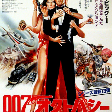Original vintage cinema poster for the Japanese release of the 007 James Bond movie, Octopussy, starring Roger Moore, Maud Adams and Louis Jourdan. Dynamic design featuring action and battle scenes with a steam train and car chase along railway tracks, Acrostar mini jet planes, a tiger and an elephant, a man aiming a rifle gun and scantily clothed Bond Girls, the hilltop Monsoon Palace in Udaipur India and other characters from the film in the background, a smartly dressed Roger Moore holding a gun and Maud Adams in a red dress with her eight Octopussy arms around James Bond holding a Faberge egg, cocktail glass and dagger in the foreground, the stylised title text below in bold red lettering. Very good condition, light fold bottom right corner.
