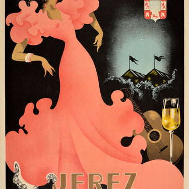 Original vintage poster advertising the Jerez Feria de Primavera / Jerez Spring Fair from 30 April to 3 May 1953 featuring a traditional Spanish flamenco dancer in a swirling pink dress with a glass of sherry and guitar on the side and flags on top of buildings behind the outline of trees against the night sky below a coat of arms with the stylised title lettering below. Jerez de la Frontera is located in the Andalusia region of Spain and is known as a world leader in the production of the fortified drink of sherry wine. Good condition, restored tears, restored folds, restored creasing, staining, backed on linen.
