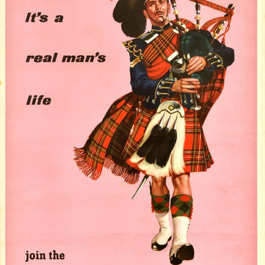 Original vintage British Army recruitment poster - It's a real man's life Join the Regular Army - featuring a Scottish Regiment soldier of the Scots Guards in traditional Scottish tartan and kilt uniform playing the bagpipes as he marches towards the viewer, set against a pink background. Fair condition, creasing, staining, tears, foxing.