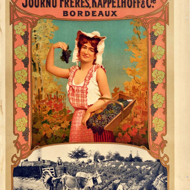 Original antique drink advertising poster for Journu Freres, Kappelhoff & Cie. Bordeaux wine featuring a colourful image of a smiling grape picker holding a basket of grapes and a bunch in her hand to show the viewer, a black and white photo below showing workers in the vineyard with oxen pulling a cart along the lane, the title text at the top within a decorative grapevine border. Good condition, staining, punched holes, tears, paper loss on the bottom left corner, foxing.