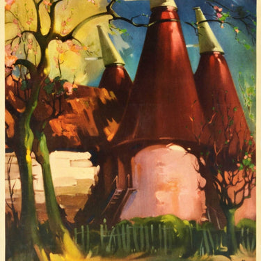 Original vintage travel poster for Kent served by British Railways featuring a colourful illustration by the notable painter and poster artist Claude Buckle (1905-1973) of traditional oast houses and flowering trees in spring bloom with the title in yellow lettering below. Published by British Railways (Southern Region). Printed in Great Britain by Waterlow & Sons Limited, London and Dunstable. Very good condition, minor creasing, minor staining, backed on linen.