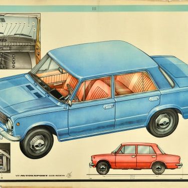 Original vintage car advertising poster for Lada showing the exterior and the interior of the vehicle with smaller images of the dashboard and panel board as well as the dimensions of the car from the front and side, the text below - v/o Avtoexport SSSR Moskva / Autoexport USSR Moscow. Manufactured by AvtoVAZ as an affordable car, the Russian Лада / Lada brand was launched in 1973 for the export market. Horizontal. Good condition, tears, paper losses on edges, staining, creasing.