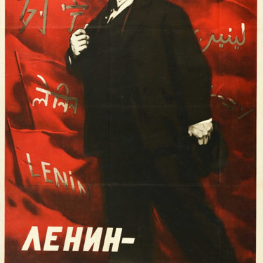 Original vintage Soviet propaganda poster - Lenin is the banner of Communism! / Ленин знамя Коммунизма! - featuring an image of Lenin in front of red flags with his name in different languages on them, the slogan in bold white below. Good condition, folds, staining, creasing, small tears on margins.