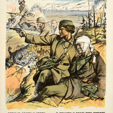 Original vintage World War Two Soviet propaganda poster - Faithful to the duty and honour of the land defending their own with fathers and brothers Leningrad women go into battle together / Верные долгу и чести края защищая свои С отцами и братьями вместе идут Ленинградки в бои - featuring a young lady in military uniform tending to a wounded soldier with a bandage around his head whilst holding up a pistol gun in her other hand, carrying a medical Red Cross bag around her shoulder, in front of a battle scene showing army soldiers in uniform on a hill and a dead Nazi German soldier on the ground with explosions behind them and smoke rising from the city skyline on the horizon, the bold black text below. The Siege of Leningrad (now St Petersburg) was a military blockade by Nazi Germany that lasted from 1941-1944, causing destruction to the city and a huge loss of civilian life (more than the combined casualties of America and Britain during the entire war). Excellent condition, minor staining, backed on linen.