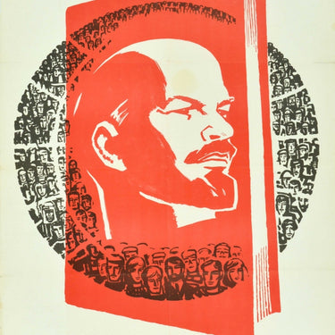 Original vintage Soviet propaganda poster featuring an image of Lenin on a red covered book surrounded by a circle of people in black and white with the text below - Lenin's Ideas Win! Идеи Ленина побеждают! Good condition, folds, creasing, repaired tears, staining.
