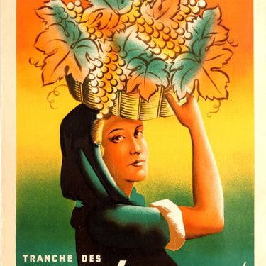 Original vintage advertising poster for the French National Lottery / Loterie Nationale 19th issue of 1941 - the harvest issue for the benefit of the national emergency. Colourful image of a lady carrying a basket on her head full of grapes with the text above and below in stylised white, black and yellow letters. Designed and printed by Imp. Lafayette, Paris. Very good condition, minor tears and folds on margins.