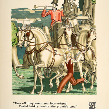Original vintage London Transport poster promoting travel by Green Line Coach featuring stunning artwork by the notable French Art Deco designer Jean Dupas (1882-1964) depicting men in smart suits and top hats riding on a horse drawn carriage in the countryside, the coachman holding up a whip and the man sitting behind him blowing on a horn, a lady running in the foreground with an estate and trees on the hills in the background, the LPTB logo with a poem and title caption below - "Thus off they went, and four-in-hand Dash'd briskly tow'rds the promis'd land." To-day in comfort by "Green Line" Coach. The London Passenger Transport Board LPTB (1933-1948) symbol designed by C W Bacon was replaced by the iconic London Underground roundel less than a year after its invention. Printed by Johnson, Riddle & Co. Ltd., London. Very good condition, creasing, minor staining, backed on linen.
