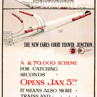 Original antique travel advertising poster: The New Earls Court Flyover Junction – A £70,000 scheme for catching seconds – Opens Jan 5th – It means also more trains and more accommodation on the Wimbledon and Putney Line. Great design featuring a technical cutaway drawing of the London Underground District and Piccadilly railway lines showing the new flyover junction with a view above of boats on the River Thames and historical buildings and people along its banks, hills in the distance and a steam train running past with stylised text below and Underground above, all in black and white with some red for the tube carriages, boats, the Underground logo and part of the text. Artwork by Charles Sharland. Published by Electric Railway House, Westminster. Printed by Waterlow & Sons Ltd., Lith – London. Excellent condition, backed on linen.