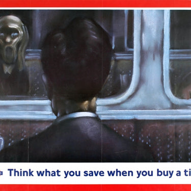Original vintage London Underground poster – Think what you save when you buy a ticket – featuring a dark and gloomy image of a man wearing a suit sitting in the tube with a reflection of his face in the opposite window showing an expression of terror as Edvard Munch's famous painting The Scream with the text below in blue letters next to the London Underground logo inside a red border. This design was created by the London agency Bainsfair Sharkey Trott (founded by Paul Bainsfair and John Sharkey with Dave Trott), commissioned by London Transport for their advertising campaign from 1992-1997. Horizontal. Good condition, folded as issued, creases.