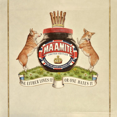 Original food advertising poster for Marmite featuring a fun illustration in the style of the royal coat of arms depicting two corgi dogs standing on the sides of a jar of Marmite labelled Ma'amite Limited Edition Toasting The Queen's Diamond Jubilee over the Union Jack flag with bread slices in a toast rack above forming the shape of a crown and a ribbon below the grass and flowers with the text - One either loves it or one hates it - showing the corgi on the left licking its lips and the corgi on the right looking to the side in disgust, the image set within a regal gold line border. Issued in celebration of the 60th anniversary of the accession of Queen Elizabeth II in 2012. Large size. Good condition, folds, creasing, small tears, minor staining.