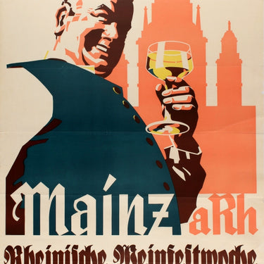 Original vintage drink advertising poster for a wine festival held in Mainz aRh / Mainz am Rhein / Mainz on the Rhine in Germany from 16-24 May 1936 in the Town Hall Adolf Hitler Platz (renamed Jockel-Fuchs-Platz; previously called Halleplatz). Striking design featuring a smiling man holding up a wine glass in front of a silhouette of the historic Mainz Cathedral (St Martin's Cathedral; founded 976) in the Old Town with the stylised gothic title text and event information below including wine tasting dates and the cost of wine from 20 pfennig. This event was created by the Nazi government to increase sales of German wine with festivals and parades organised in many towns and cities in wine growing regions; Mainz has grown wine since Roman times and hosts the annual Mainzer Weinmarkt wine market. Large size. Good condition, folds, tears in margin, minor paper losses, creasing.