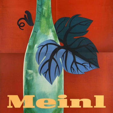 Original vintage drink advertising poster for Meinl featuring an image of a green wine bottle with a grape leaf set on a red background. Julius Meinl opened in 1862; by 1913 the company was the largest importer of tea and coffee in Central Europe; the company's flagship store Julius Meinl am Graben in Vienna includes a wine bar in the cellar - Julius Meinl Wein Bar. Printed by F. Adametz, Vienna. Large size. Good condition, folds, creasing, small tears on edges, 2 sheet poster.