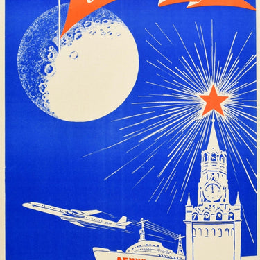 Original vintage Soviet space race era propaganda poster - Union of Soviet Socialist Republics USSR September 1959 In the Name of Peace and Progress! / Союз Советских Социалистических Республик СССР Сениябрь 1959 Во Имя Мира И Прогресса! The Soviet Union sent the first probe to the Moon's surface on 14th September 1959. Colourful design on a blue background featuring a shining red Soviet star on the Moscow Kremlin clock tower with a plane flying at speed above a ship marked Lenin on the curve of the globe earth below the text and logo on a large flag on the moon above. The Soviet Union launched Luna 1 (aka Mechta / Dream) on 2 January 1959, the first lunar spacecraft and human-made object to leave the earth's orbit and fly by the moon. Large size. Good condition, restored paper losses, restored tears, backed on linen.