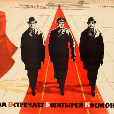 Original vintage movie poster for documentary film Moscow Greets Hero Cosmonauts featuring a bold illustration of three men in suits, the man in the centre wearing a military hat, walking along a red carpet from a plane towards the viewer with a large red Soviet flag adorned with a star and hammer and sickle flying on the side, and the title below. Horizontal. Very good condition, minor creasing and restored tears in margin, light staining in margin.