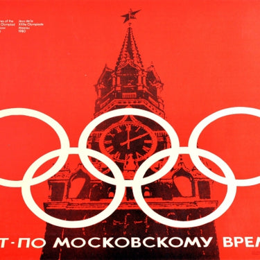 Original vintage Soviet sports poster for the 22nd Summer Olympic Games / Games of the XXII Olympiad in 1980 held in Moscow Russia, featuring an illustration of Moscow's Kremlin Spasskaya Tower with the Kremlin Chimes Clock in the centre - five white Olympic rings set over the image, the central ring encircling the clock face. Set over red background, with caption below: Старт - по Московскому времени / Start - on Moscow time. The Moscow Olympic Games logo of white lines leading up to a star with the five Olympics Rings below is displayed in the left top corner. Horizontal. Very good condition, minor creasing.