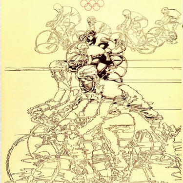 Original vintage sport poster for the 1980 Olympic Games held in Moscow Russia featuring a dynamic design of cyclists speeding around a track competing against each other on their bikes with the cycling event symbol and Moscow Olympic logo and rings in red above, the title in Russian, English and French within an Olympic coloured lines border - Games of the XXII Olympiad Moscow 1980. Excellent condition.