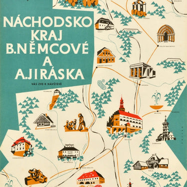 Original vintage pictorial travel map Nachod Region B. Nemcove and A. Jiraska invite you to visit / Nachodsko Kraj B. Nemcove a A. Jiraska vas zve k navsteve, featuring a pictorial map of Nachod Region marking the local places of interest with castles, monuments, and natural locations. Good condition, creasing, staining, small tears, paper skimming in bottom left corner.