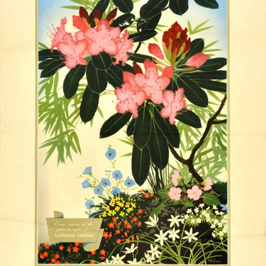 Original vintage advertising poster - National Savings Through the Post Office Savings Bank, The Trustee Savings Bank and National Savings Certificates - featuring colourful artwork of red, yellow, white, blue and pink flowers with green leaves and the caption on the side - Every season of the year is right for National Savings - and the National Savings logo and title text in stylised blue lettering below. Issued by the National Savings Committee London, the Scottish Savings Committee Edinburgh and the Ulster Savings Committee Belfast. Printed for H.M. Stationery Office by Fosh & Cross Ltd, London. Fair condition, folds, tears, creasing, paper losses on edges.