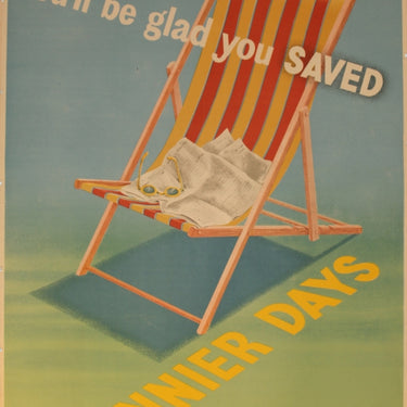 Original vintage advertising poster for a National Savings club. You'll be glad you saved for sunnier days. Fantastic image in bright bold colours with a picture of a deck chair in front of a blue sky. Issued by the National Savings Committee London, the Scottish Savings Committee Edinburgh and the Ulster Savings Committee Belfast. Printed for HMSO by Chromo Works Limited London 1951. Excellent condition.