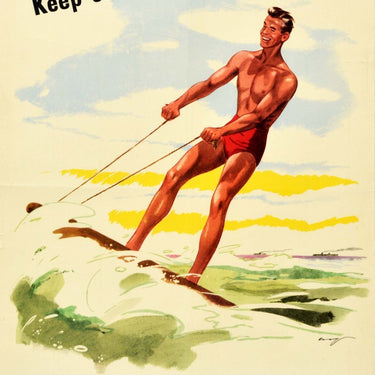 Original vintage advertising poster for National Savings featuring a great image of a smiling surfer on a board riding the waves with the message diagonally above and below - Keep on the crest of the wave keep on with National Savings after your holiday - in bold black letters. Issued by the National Savings Committee, London. Printed for H.M. Stationery Office by Fosh & Cross Ltd., London. Good condition, folds, creasing, tears, minor staining.