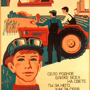 Original vintage Soviet patriotic propaganda poster promoting education and hard work - The native village is the dearest in the whole world, you are as responsible for it as you are responsible for yourself - featuring a great agriculture illustration of a young tractor engineer in a red sweater and overalls looking at the viewer with two men operating a tractor in a farm field of wheat behind him, and an image of a student sitting at the desk in a classroom learning about tractors and machinery engineering depicted next to the blackboard. Fair condition, folds, creasing, staining, foxing.