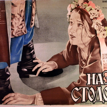 Original vintage film poster for a Ukrainian film (Назар Стодоля) directed by Georgi Tasin based on a play by Taras Shevchenko. Image of a lady wearing traditional clothing with a floral headdress lying on the floor, looking up pleading with an unseen man, her hands on his boots. Horizontal.