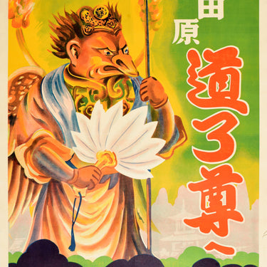 Original vintage Japanese train travel poster advertising a New Year's visit to the shrine in Odawara in the Kanagawa Prefecture by Sunzu Railway - 初詣り小田原 神奈川縣 駿豆鉄道 - featuring a colourful design depicting a winged figure holding a fan and a staff with the bold text above, on the side and below the image. During the New Year period the historic city of Odawara in Japan hosts a traditional Hatsumode 初詣 (the first visits to Shinto shrines and Buddhist temples to mark a fresh start to the new year for good luck and to pray for peace and happiness). Very good condition, light fold, backed on linen.