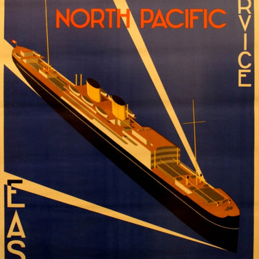 Original vintage shipping poster advertising Passenger Service to North Pacific by East Asiatic Co. Ltd. Great image featuring Art Deco text with with a ship steaming through the centre on a blue background. Good condition, light creases on margin, small loss on bottom margin.