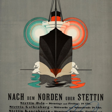 Original antique cruise travel poster - North Via Szczecin Travel to Scandinavia on modern passenger liners / Nach Dem Norden Uber Stettin Reisen Sie nach Skandinavien mit den modernen Passagierdampfern - featuring a stunning Art Deco design of a steam ship sailing at sea towards the viewer with its red and black funnel rising between the starboard and port lights on the depicted as green and red concentric circles reflected on the water below, set on a grey background with the text in black below including information on the routes - Stettin / Szczecin to Oslo Szczecin to Gothenburg Szczecin to Copenhagen / Kopenhagen Szczecin to Western Norway / Westnorwegen and Kopenhagen / Copenhagen to Oslo. Good condition, restored paper losses, restored tears, blue pencil mark over text, backed on linen.