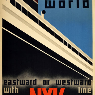 Original vintage travel advertising poster - Around the World Eastward or Westward with NYK Line - featuring a stunning streamlined Art Deco design by the Swedish artist Gosta Georgii Hemming (1910-1986) depicting a steamship sailing at speed against a sky blue background, the bold text above and below with stylised blue sea waves. Founded in 1885 the Nippon Yusen Kabushiki Kaisha / Japan Mail Shipping Line is a Japanese shipping company providing passenger and cargo transport services. Printed by Shueisha Printing Co Ltd Japan. Good condition, pinholes, restored tears, restored creasing, restored folds, backed on linen.