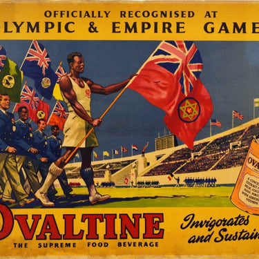Rare original vintage drink advertising poster for Ovaltine - Officially recognised at Olympic & Empire Games Ovaltine the supreme food beverage Invigorates and Sustains - featuring a colourful illustration of groups of athletes carrying flags of their countries and walking around the stadium filled with spectators in the stands, more flags flying against the blue sky above with a jar of Ovaltine on the side, the label reading - A concentrated extract of malt, milk, cocoa and eggs. Fortified with additional vitamins - and the title text in bold stylised lettering on the border above and below. Founded in Switzerland in 1904 Ovomaltine is a chocolate cocoa malt milk drink exported to the UK as Ovaltine in 1909 and based at a factory in Kings Langley Hertfordshire (the company's Art Deco building closed when production ended in 2002); the dried powder can be mixed with hot or cold milk to make the drink. During 1948 London Olympics it was supplied to athletes as a performance enhancing drink. Horizontal. Poor condition, several restored paper losses, restored tears, restored folds, staining, backed on linen.