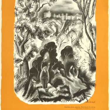 Original vintage GPO General Post Office poster - Clear and correct addressing speeds your mail - featuring a great black and white illustration by the artist and wood engraver John Farleigh (Frederick William Charles Farleigh; 1900-1965) depicting Windsor Castle visible on the horizon through the trees from a scene in the Shakespeare comedy The Merry Wives of Windsor in which Sir John Falstaff is 'pinched' for his villainy by the Mistress Quickly's fairies - "Postmen are as earthbound as Mistress Quickly's fairies. They sort letters by addresses rather than by inspiration; and to carry a letter to Windsor or anywhere else, it is useful to have the right address. For the record, the correct address of the scene of Sir John Falstaff's discomforture is: Windsor Great Park, Windsor, Berks" - the text below in black and red against the orange border. Printed by The Baynard Press. Good condition, creasing, tears, pencil on bottom edge.