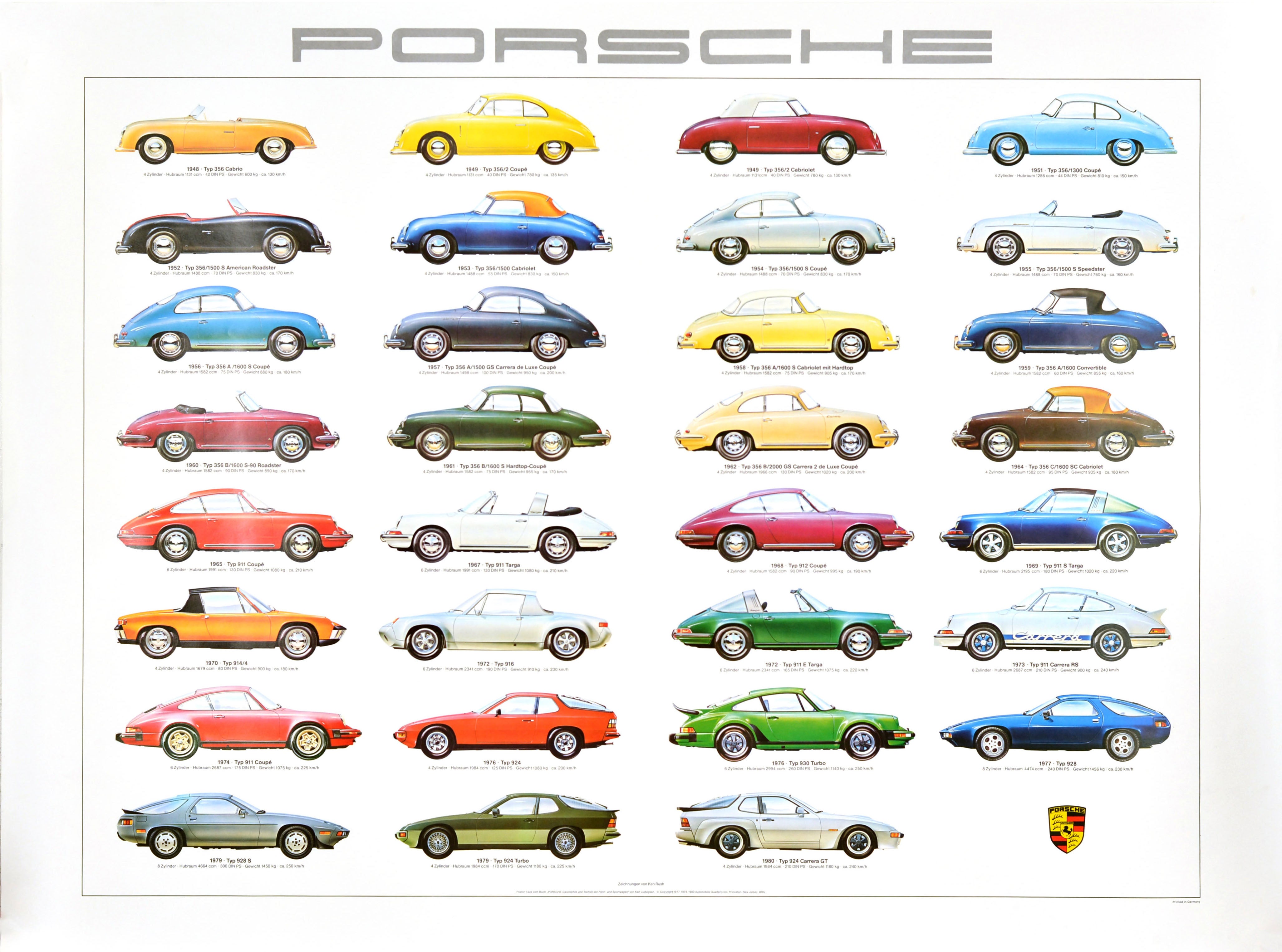 Original vintage advertising poster for Porsche car models depicting various cars including the 356, 911, 912, 914, 916, 924, 928 and 930 models produced from the Typ 356 Cabrio released in 1948 to the Typ 928 released in 1977. Great artwork of these iconic cars by the American artist Ken Rush originally published in the Automobile Quarterly Library Series book Excellence Was Expected: The Complete History Of Porsche Sports And Racing Cars by Karl Ludvigsen that was first published in 1977. Founded in Stuttgart in 1931 the German automobile manufacturer Porsche AG specialises in the production of high-performance sports cars as well as SUVs and sedan cars. Horizontal. Excellent condition.