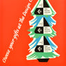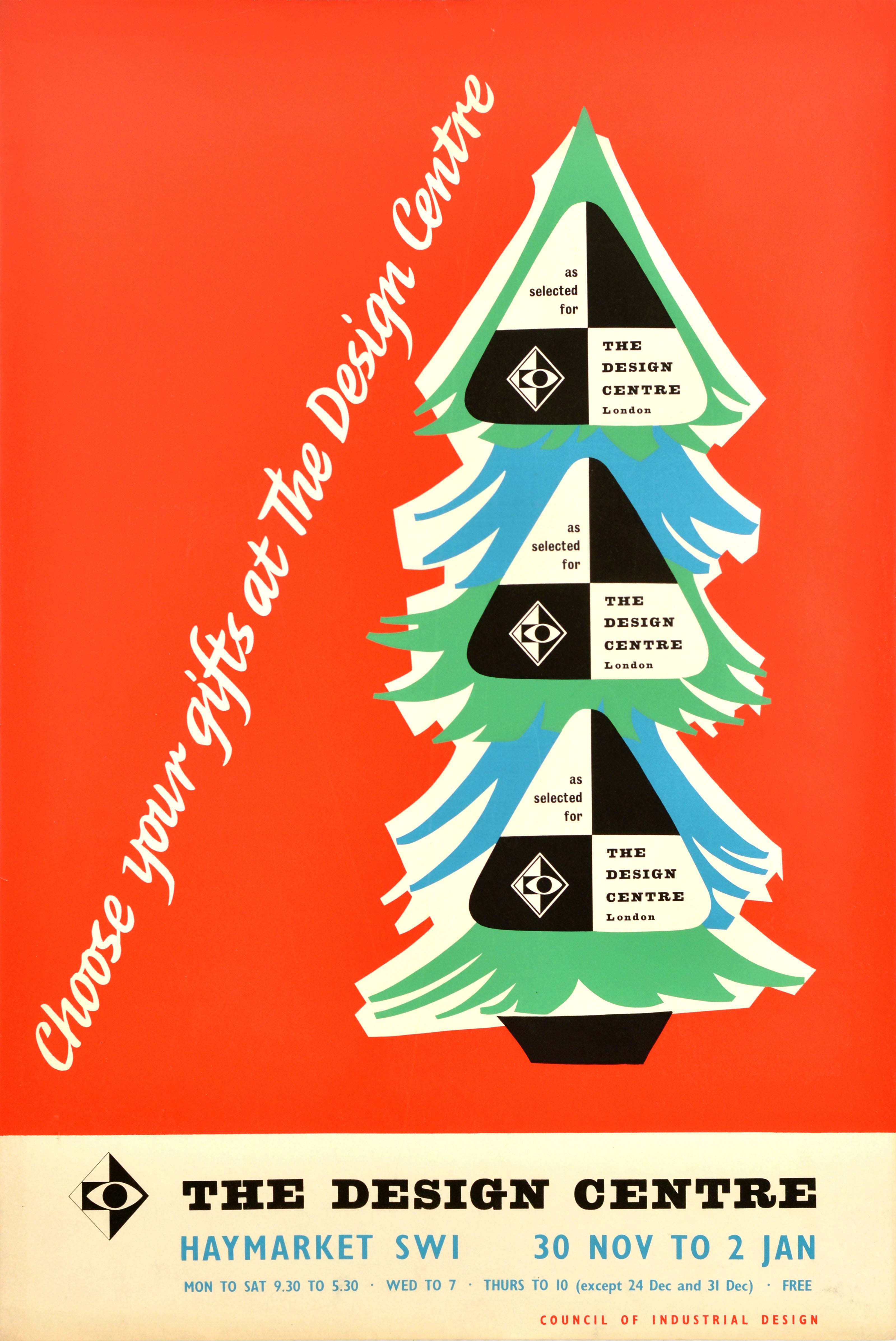 Original vintage advertising poster for The Design Centre London featuring a stylised image of a Christmas tree in green and blue with black and white insets as decorations on it, set on a red background with white lettering diagonally up the side - Choose your gifts at The Design Centre - and the opening hours and rest of the information below - Haymarket SW1 30 Nov to 2 Jan Council of Industrial Design. Issued by the Council of Industrial Design. Good condition, creasing, staining.