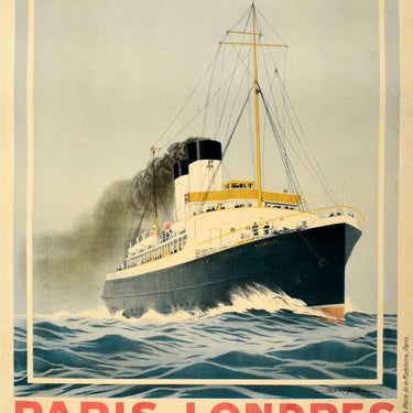 Original antique railway travel advertising poster for trips from Paris to London in 2 hours 45 minutes - Chemins de Fer de l'Etat et de Brighton Paris (St Lazare) London (Victoria) via Dieppe et Newhaven 2h45 de traversee maritime - featuring an image of the sea crossing by steam ship on the Channel / la Manche with the bold text above and below. Artwork by the marine artist Sandy Hook (Georges Taboureau; 1879-1960). Good condition, restored folds, restored tears, restored paper losses, restored creasing, minor staining, backed on linen.