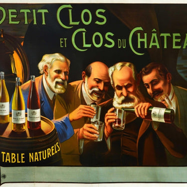Original antique drink advertising poster for Petit Clos et Clos du Chateau wines featuring a bright and colourful illustration of four men with moustaches and beards in a wine cellar lit by a lantern, smiling while holding glasses and pouring Petit Clos Burgundy red wine with more bottles of red and Clos du Chateau white wine on a barrel marked Vins de Table Naturels / Natural Table Wines, the green and yellow stylised lettering over the image. Printed by Imprimerie Publicite Etabl Vecasson 6 Rue Mariel Paris. Horizontal. Large size. Good condition, restored folds, restored creasing, restored paper loss, restored tears, backed on linen.