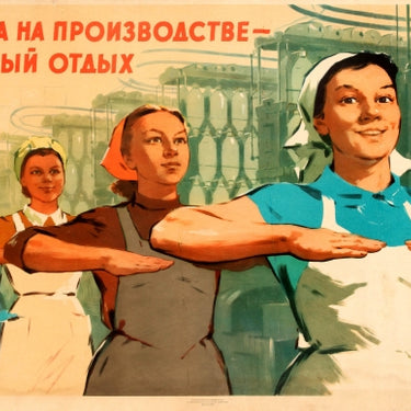 Original vintage Soviet propaganda poster promoting physical exercise at work for an active life to improve health and well-being "Зарядка на производстве - активный отдых" featuring a row of smiling healthy workers doing some sport exercises during their work break from a factory with industrial machines depicted in the background, the title above in red letters. Horizontal. Fair condition, restored tears and deep folds, light staining, backed on linen.