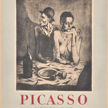 Original vintage lithographic poster for an art exhibition, June to September 1955 featuring the graphic works of Pablo Picasso at the Bibliotheque Nationale / Picasso l'oeuvre grave, Juin - Septembre 1955. Image of Picasso's 1904 etching, The Frugal Meal (Le Repas Frugal), printed in 1913, featuring a thin man with his arms around a lady sitting behind a table with a small piece of bread and wine for their meal. The notable Spanish artist and sculptor, Pablo Picasso (1881-1973), was one of the founders of Cubism in the early 20th century. Mourlot Paris. Edition 2,500. Good condition, repaired small tears and loss on margins, backed on linen.