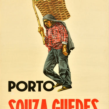 Original vintage drink advertising poster for a fortified port wine produced in Porto Portugal - Porto Souza Guedes - featuring an illustration of a worker carrying a large woven basket of grapes on his back with the title in bold red and black lettering below. Printed by Bertrand (Irmaos) Lisbon. Good condition, creasing, paper losses on edges, tears, staining, pinholes.