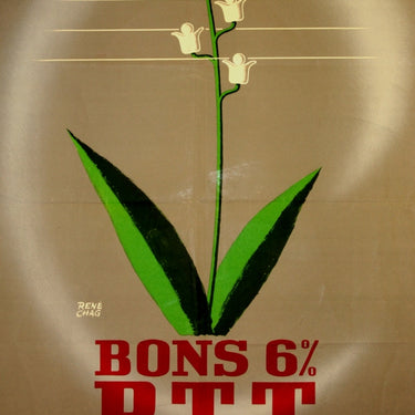Original vintage poster for Post Office Bonds PTT 6%. Great image of a snowdrop flower as a telegraph pole. Printed by SA Courbet, Paris. Fair condition, minor tears on margins and folds.