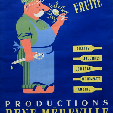 Original vintage drink advertising poster for Rene Medeville showing a wine taster (or sommelier) tasting a glass of wine. Printed in Paris.