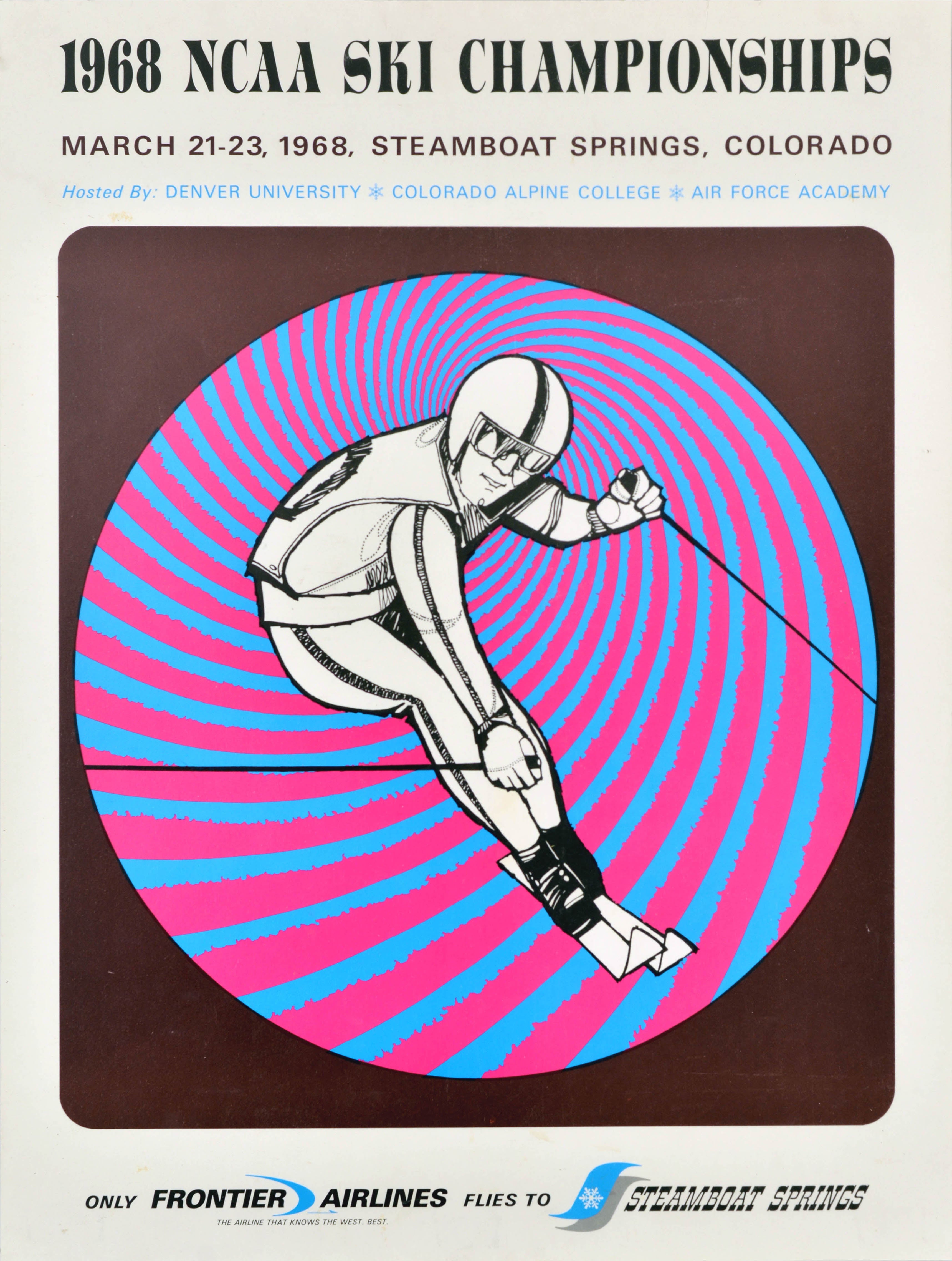 Original vintage sports poster promoting the 1968 NCAA Ski Championships held from March 21-23 in Steamboat Springs Colorado - Design features a stylised alpine skier set against a spiralling psychedelic background of vibrant pink and turquoise blue stripes. The event was hosted by Denver University, Colorado Alpine College, and the Air Force Academy. Below are logos for Frontier Airlines and Steamboat Springs. Very good condition, creasing, tears.