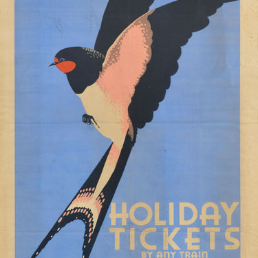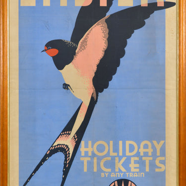 Original vintage Great Western Railway travel poster - Easter Holiday Tickets By Any Train GWR - featuring a great design depicting a stylised illustration of a swallow in flight against a light blue sky background with the title above and on the side with the GWR logo below. Printed by Waterlow & Sons Ltd London, Dunstable & Watford. Fair condition, folds, tears, creasing, staining, paper losses, framed.