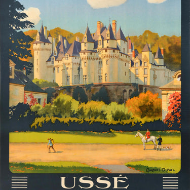Original vintage French Railways train travel advertising poster for the Loire Valley castles and motor car tours - Chemins de Fer de Paris a Orleans Usse Les Chateaux de la Loire Circuits Automobiles - featuring a stunning view by Constant Duval (1877-1956) depicting a hunter in a red jacket on a horse with hunting dogs and a person in a hat carrying a woven basket walking along the path with a stick in front of the historic Chateau d'Usse (aka the Sleeping Beauty castle) in front of trees of the Chinon forest with the text on the margin above and below. Printed by Chaix, Paris. Good condition, restored tears, restored creasing, backed on linen.