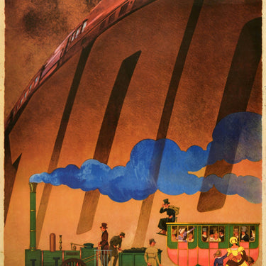 Original vintage travel advertising poster for the Centenary of German Railways Exhibition held in Nuremberg from 14 July to early September 1935 - Centenaire Des Chemins De Fer Allemands Exposition A Nuremberg - featuring a great design by the renowned graphic artist Jupp Wiertz (Joseph Lambert Wiertz; 1888-1939) depicting an old fashioned early steam locomotion with smartly dressed passengers in Victorian clothing in a green and pink carriage and a man shovelling coal into the engine behind a man holding a flag on the platform and a lady in a fashionable yellow dress and bonnet hat with a boy holding a traditional children's toy hoop waving to the passengers, the number 100 as a bridge in the background with a dynamic modern Art Deco streamliner train travelling at speed above, the title text on the border below. Printed in Germany by Weiersmuller. Fair condition, tears, paper losses, creasing, staining, folds.