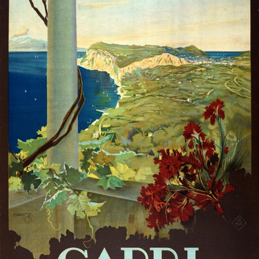 Original antique travel poster for Capri in Italy / Italia issued by the Italian tourist board ENIT / Ente Nazionale Italiano per il Turismo and Italian State Railways featuring scenic artwork by Mario Borgoni (1869-1936) depicting a balcony covered in vine leaves and flowers with a view overlooking a coastal landscape with sailing boats at sea and hillside roads leading to a town and trees in the distance, more mountains and a smoking volcano visible beyond the cliffs with the logos and title in bold stylised lettering below. The popular holiday resort island of Capri is located in the Tyrrhenian Sea off the Sorrento Peninsula in the Gulf of Naples in the Campania region of Italy. Good condition, restored tears, restored paper losses, minor staining, ink stamp, backed on linen.